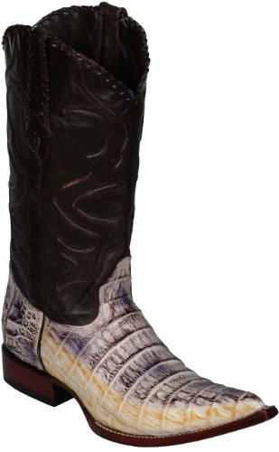 These Cowboy Boots look great with their inlay-ed shaft, Pointy Toe and Walking heel. Fully hand crafted. Features Genuine Caiman Belly Vamp & Leather uppers.